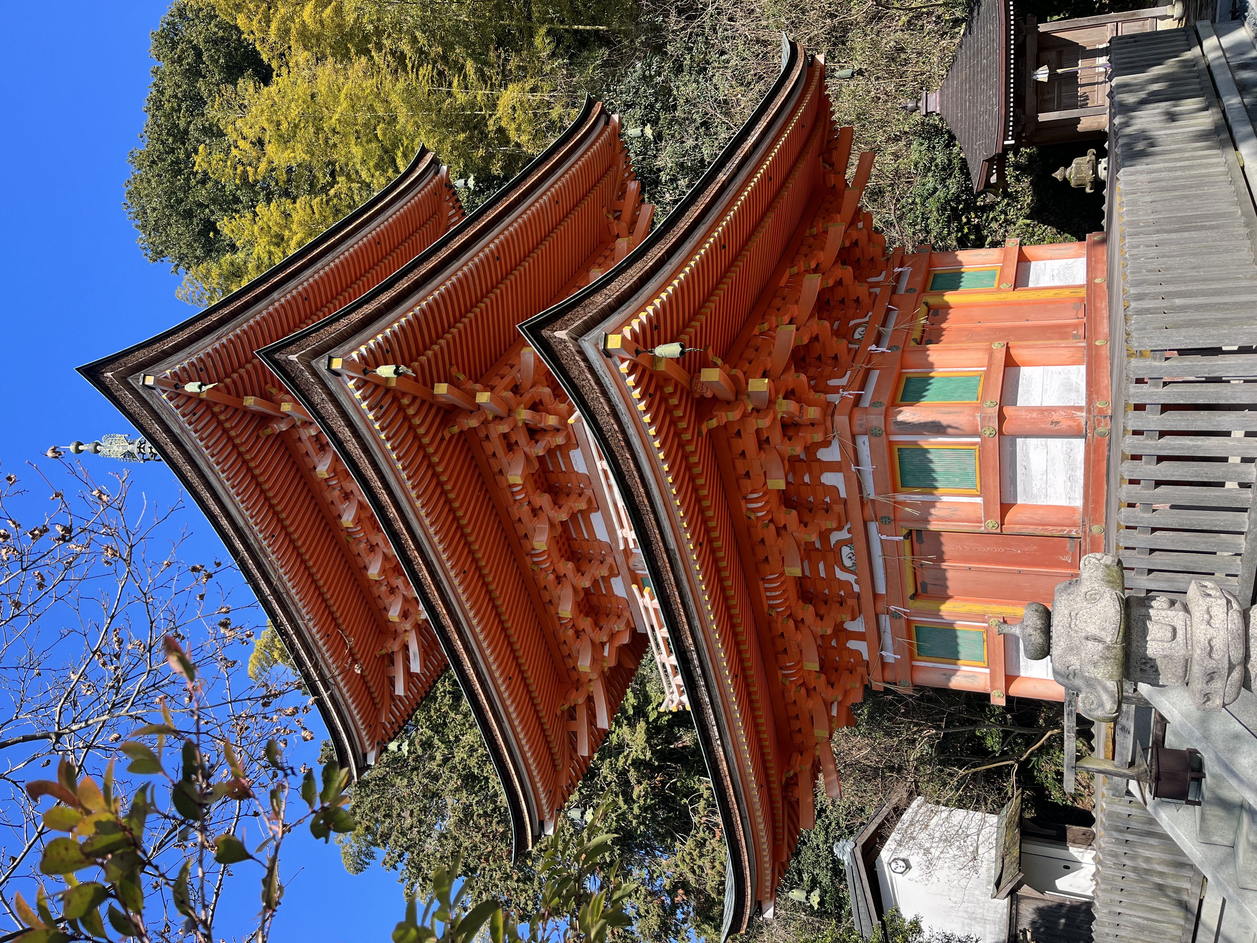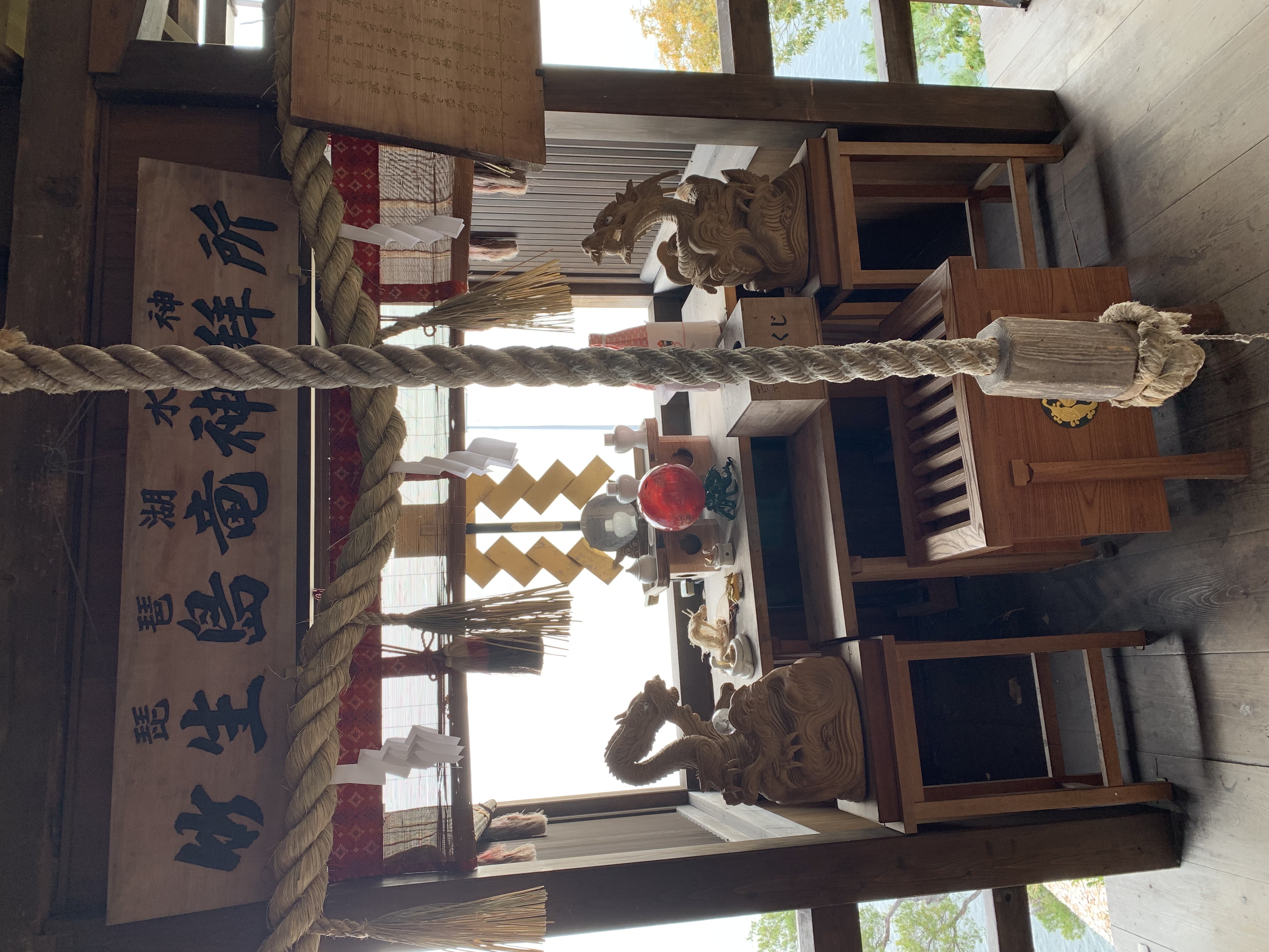 <宝厳寺・本堂> 西国観音霊場第三十番札所の宝厳寺の本堂には日本三弁財天の大弁財天がご本尊として祀られています。こちらでは紙に書いた願い事をだるまに入れる「幸せ願いダルマ」が奉納できます。 <三重塔> 三重塔は江戸時代初期に落雷によって焼失したと言われており、2000年に約350年ぶりに復元。古来の工法に基づいて建築され、6年の歳月をかけて現在の姿が完成しました。お釈迦さまの遺骨を納めた仏舎利塔をかたどっています。 <宝厳寺 国宝「唐門」・重文「観音堂」> 国宝に指定されている唐門は豪華絢爛な桃山様式の唐門の代表的な遺構であると言われています。鳳凰や兎、松や牡丹などの美しい彫刻や天井には鮮やかな文様が今も残されています。唐門内部には鎌倉時代に作られた千手観世音菩薩を納めた観音堂があります。千手観音像は秘仏とされ、開扉は原則60年に一度で普段は開扉していません。 2013年度より実施されていた、『唐門』『観音堂』『舟廊下(渡廊)』の檜皮屋根の全面葺き替え、彩色・漆塗りの塗り直し、 及び飾り金具の鍍金メッキ仕上げ等の修復保存事業は2020年春に完了し、美しい姿になりました。 <都久夫須麻神社(竹生島神社)> 宝厳寺と同じく弁財天に加え、龍神と産土神の三柱を祭神としています。本殿の先には龍神拝所があり、2枚で1組の素焼きの皿に願い事を書き、湖を望む鳥居に向かってかわらけを投げる願掛けができます。
